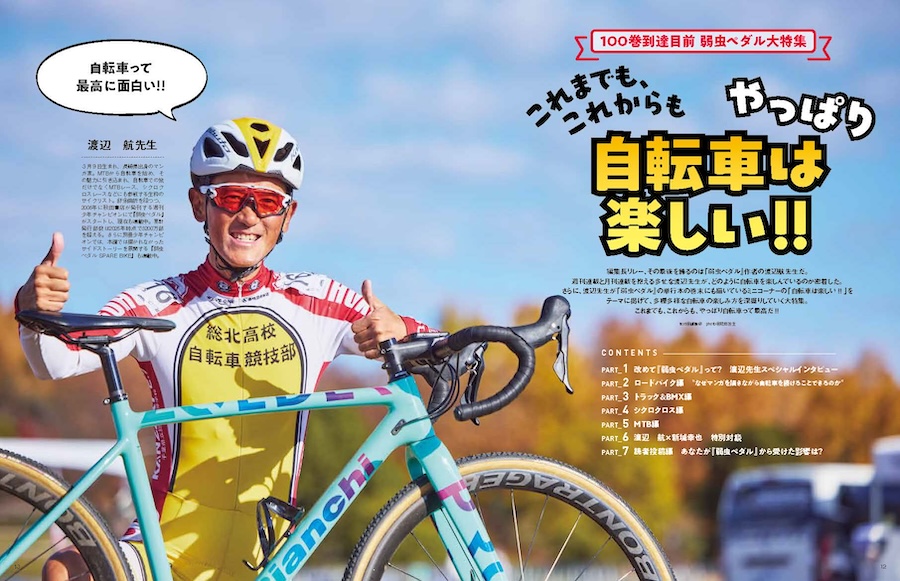 そして何より、作者である渡辺先生自身が、筋金入りの超・自転車好きとして知られている存在。大規模イベントやレース会場に現れ壇上に立っているかと思えば、自らも走り、選手たちを率いている……そんなマンガ家さん、本当にいるのか!できるのか!? 今号では、『弱虫ペダル』という作品と、渡辺先生の精力的な活動の両輪から、先生が一貫して描き続けてきた「自転車は楽しい!」というメッセージをコアに据えて特集を展開します。