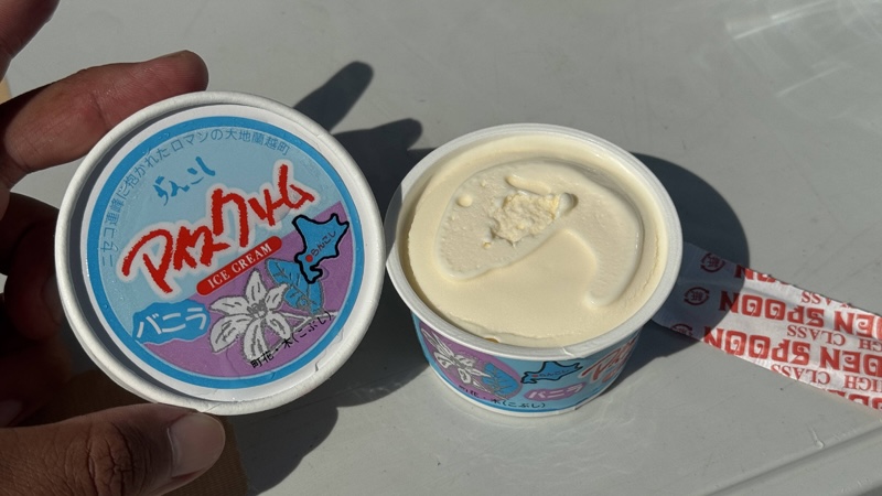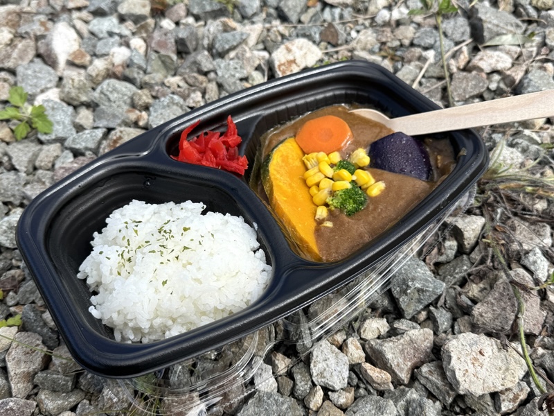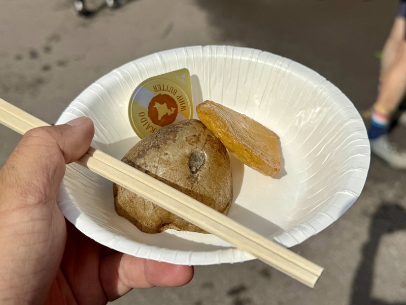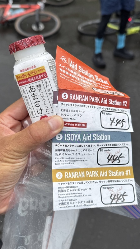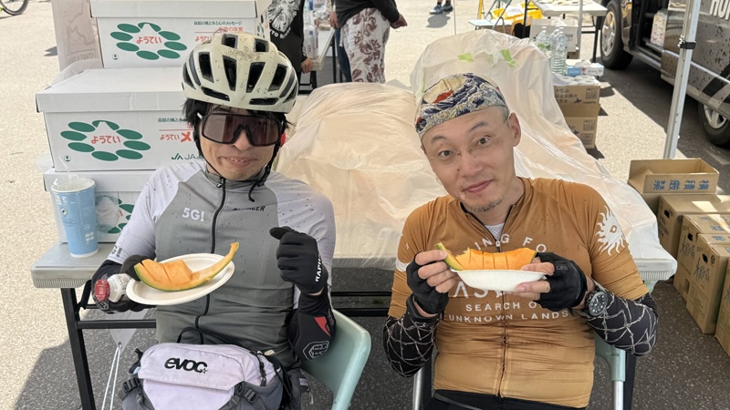 さてエイド食だが、自転車抜きに大人気のジャンルである“北海道グルメ”だ。どれもこれも、ペダルを漕いで山谷を越えてきた身体には一層おいしく感じられた。前述のカレーと並び、じゃがバター、かまぼこ、甘酒、アイスクリーム、メロン。蘭越(らんこし)エリアの特産物が勢揃いし、質量共に大満足の美食を堪能できた。ちなみに皆平等に味わえるよう、1人1食のチケット引き換え制だった。