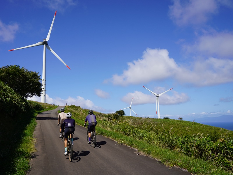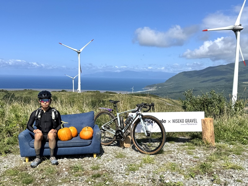 コース最大のハイライトは、丘の上に広がるビューポイント「磯谷牧場跡地」だ。クネクネと蛇行する舗装路を上ると、風車群が林立するオーシャンビューが待っていた。爽やかな風で汗を乾かし、エイドに供されたカレーが5割増しでおいしく感じる。グラベルではおなじみのソファが絶景を背にして設置され、フォトセッションの列が続いていた。ちょっとした仕掛けがコミュニケーションのきっかけとなり、グループライドはどんどん賑やかになっていく。