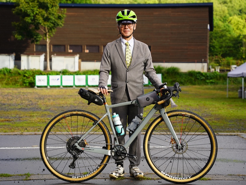 スーツにネクタイ、早朝の会場で存在感を放っていた坂東さん。2017年のニセコHANAZONOヒルクライムにブロンプトンと正装(スーツ)で参加して以降、その姿で走る様子が名物となっているそうだ。ちなみにスーツはユニクロの「感動スーツ」で、速乾性とストレッチ性がありサイクリング向きだそう。愛車は知る人ぞ知るアメリカンブランド「ドネリー」のグラベルフレーム。スピナジーのホイールにマイクロシフトのコンポと一捻りあるパーツで固められる。