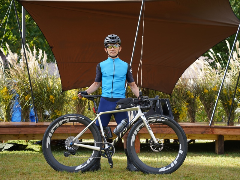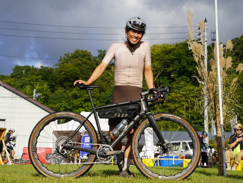 2025年5月に大阪にて開業したばかりの新興ショップ「ポイントキャンバス」のスタッフである立具(たてぐ)さん。ショップの常連さんと共にニセコ入りし、スタイリッシュな出立ちのグループが会場に花を添えた。「ニセコはお客さんを遊びのフィールドに連れていくのにピッタリの場所でした。グラベルを通じて世界が広がる感覚がいいですね!」とイベントを絶賛。バイクはオープンサイクルの希少モデル「U.P.PER. CONCE.PT」。エアロフレームにスラム・レッドXPLRを搭載したハイエンドレーシングバイクだ。