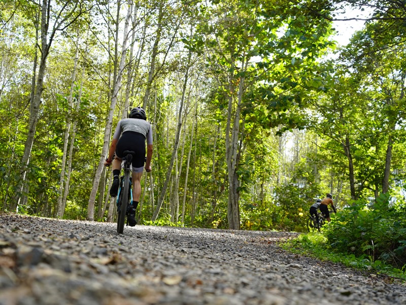 スタート直後は冷たい雨が続いたが、舗装路のクライミングで火照る身体を冷やすにはちょうど良かった。最初の林道区間に入るころには晴れ間が差し、最高のサイクリング日和に。湿り気を帯びたトレイルはややテクニカルさを増したものの、しっとりとグリップの効く極上オフロードが伸びていた。