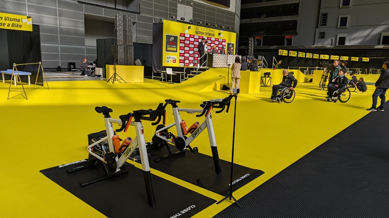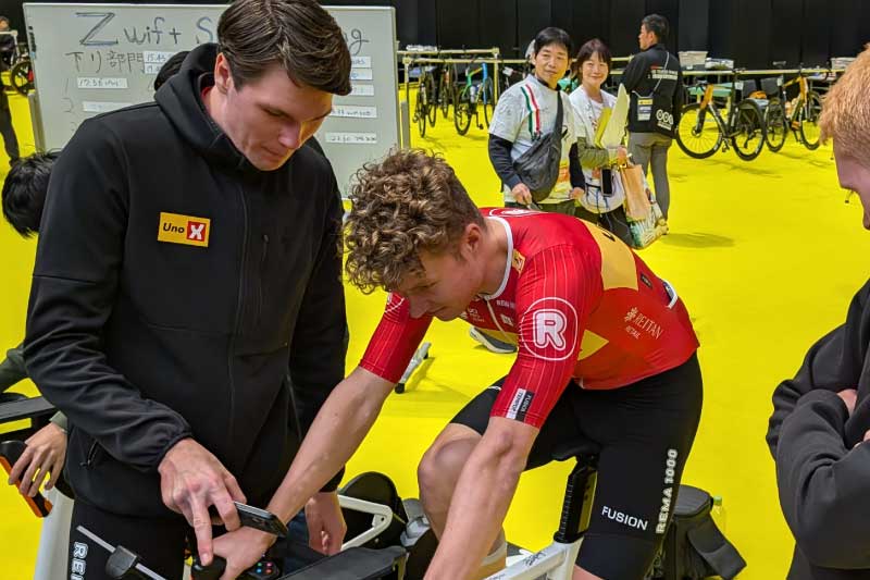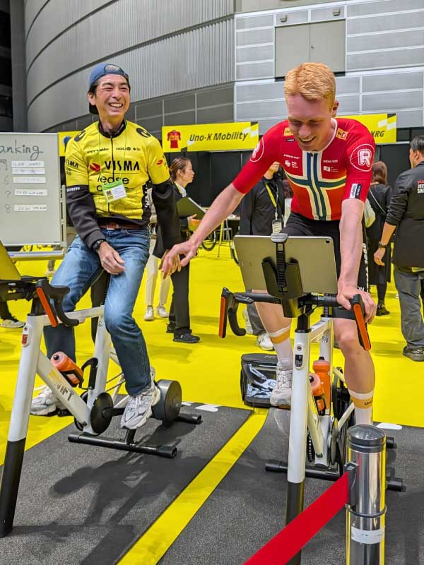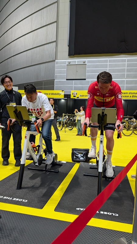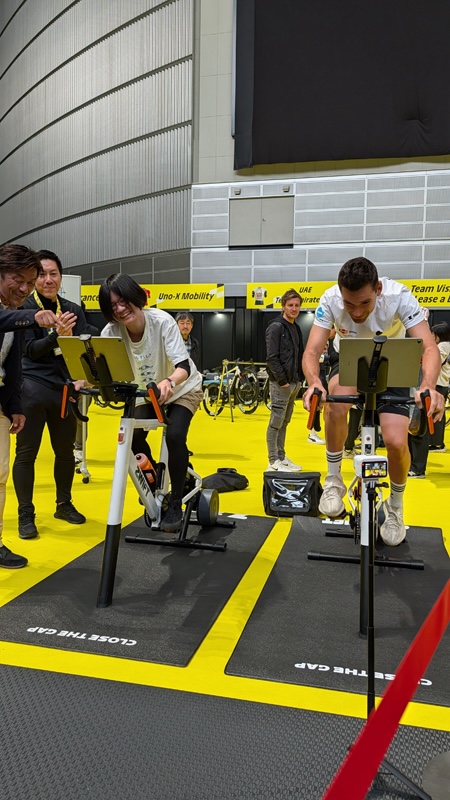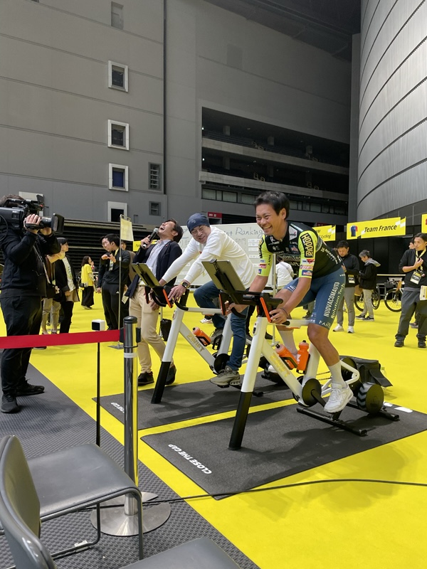 そこで、「アルペシン・ドゥクーニンク」「ウノエックス・モビリティ」の選手と、新城幸也選手(チームソリューションテック・ヴィーニファンティーニ)が、ステージ脇にセッティングされたZwift RIDE(※)にまたがって、Zwift上での“シャンゼリゼ通り”を舞台に、ファンとの200mスプリント対決を楽しんだ。