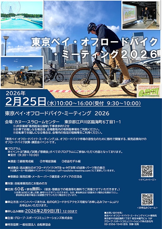 2026年2月25日(水)、東京・江戸川区のカヌー・スラロームセンターで、MTBなどオフロードバイク市場の活性化のための販売店向け試乗、講習会イベント「東京ベイ・オフロードバイク・ミーティング 2026」が開催される。