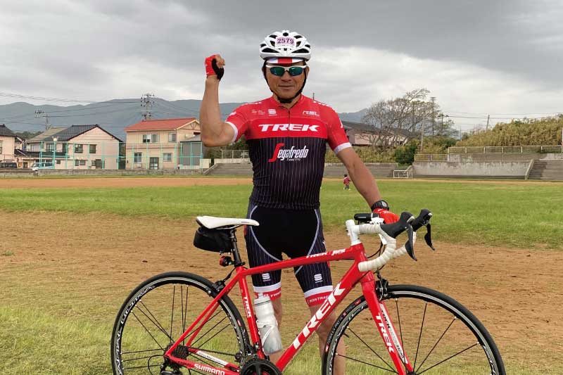 「去年はゴール閉門30分前、今年は12分前! ギリギリでした。風が強くて、特に折り返してからの坂がきつかった……。でも”何が何でもゴールしなきゃ”って思って走り切りました!」と語るのはトレックのウェアとバイクでバッチリ決めて参加の加賀崎さん。学生時代にキャンピング車で旅をしていた経験の持ち主。しばらく離れていたが、車・バイクを経て再び自転車にリターン。「かっこから入りました(笑)」と笑顔で話してくれた。