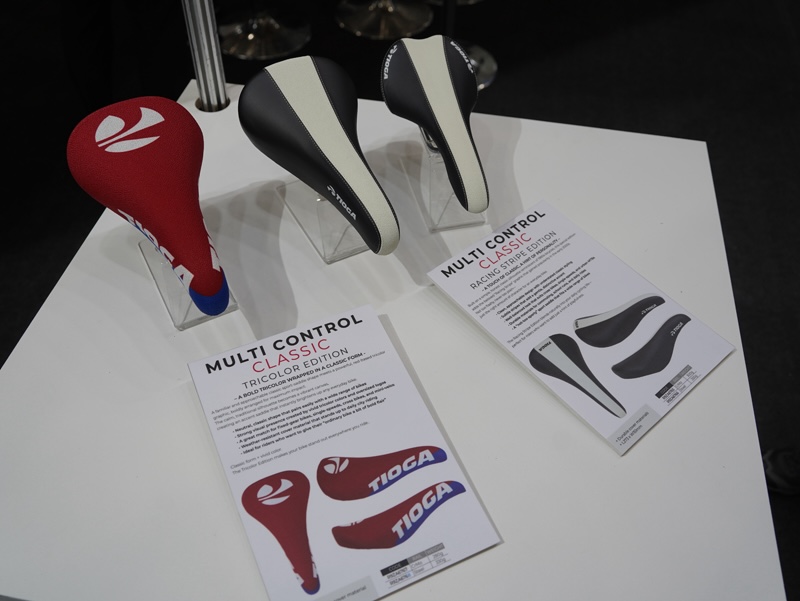 「Tioga(タイオガ)」はかつて一世を風靡したダウンヒルサドルと、D型のフランジが特徴的なグリップを復刻展示。アルミハンドルの新製品はシャロードロップのグラベル版、適度なフレア角とエアロトップのオールロード版が揃う。