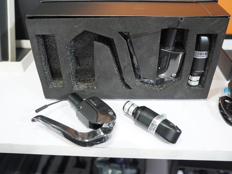 続いてサードパーティコンポーネント「Wheeltop(ホイールトップ)」。電動シフト+油圧ブレーキをリーズナブルに叶えるコンポーネントにTTバージョンのシフターレバー「EDS TT7110」が追加された。従来品の同社リヤディレーラーとペアリングし、デジタル調整により7〜13速のカセットと互換性がある。グラベル用ディレーラーとの併用も可能だ。