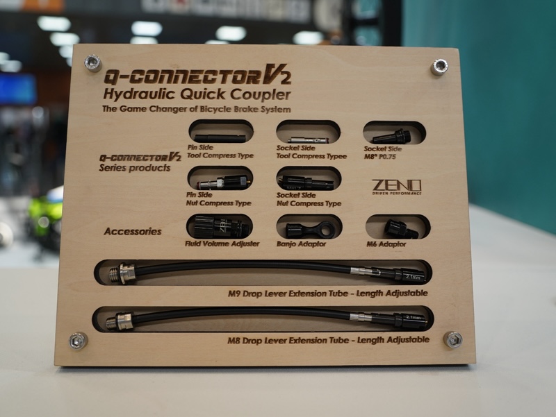台湾メーカー「ZENO(ゼノ)」のブースではアワード受賞の油圧ホースコネクターを発見。コネクターを挟むことでハンドル下でホース脱着が可能、組み立ての簡素化とヘッドベアリングの整備性を向上させる。完成車メーカーには福音と言える画期的なアイテムだ。シルバーポリッシュの機械式ディスクキャリパーにも注目。