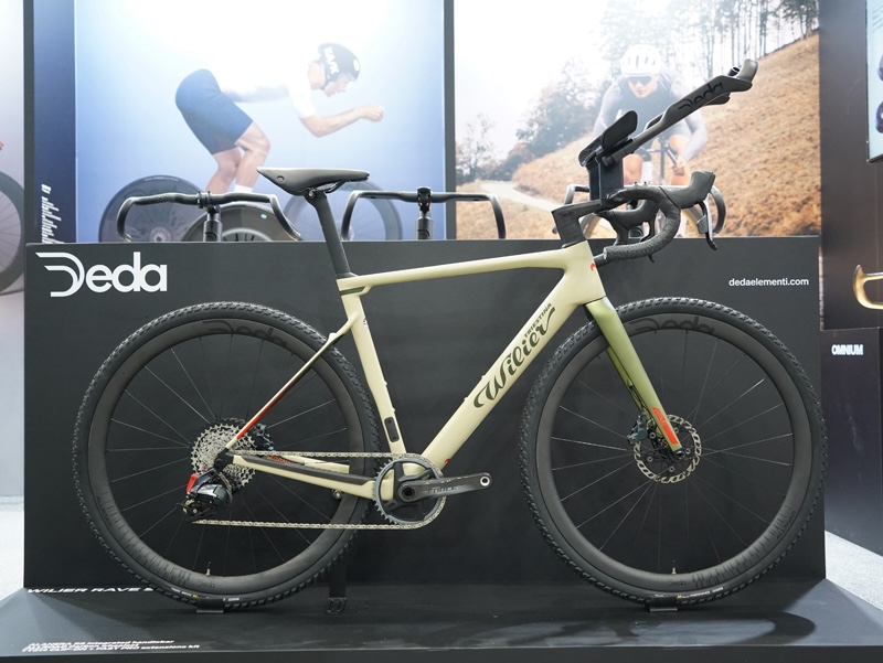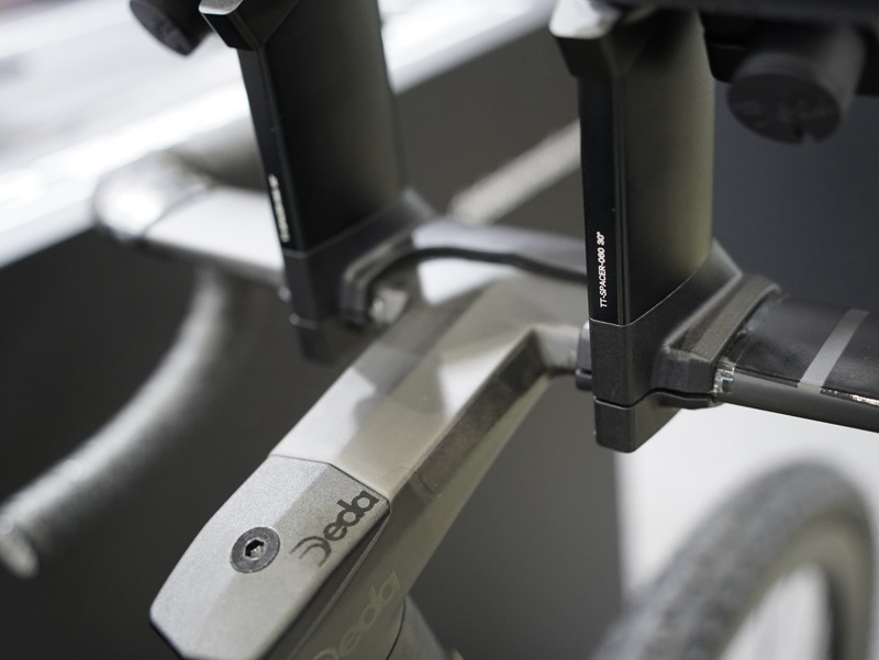 高品質なステアリングパーツが揃うイタリアの「デダエレメンティ」。写真はウィリエールのグラベルバイクにエアロバーを追加したエアロカスタム。同社のフラッグシップ一体型ハンドル「アラネラRS」をベースに、TT314クリップオン+ファストプロエクステンションキットを装備。ベースマウントは上ハンドルに挟み込むようにして装着され、カーボンへのストレスを回避する設計が見てとれた。