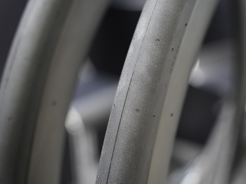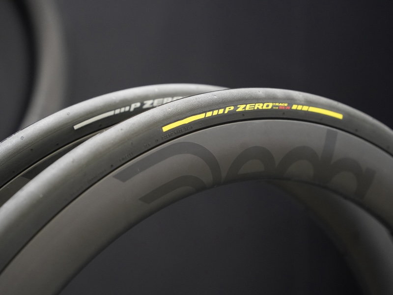 ピレリの新型ロードタイヤ「Pゼロレース TLR SL-R」。ショルダー部の形状を最適化、整流効果を高めている。トレッドには丸いパターンが刻まれていた