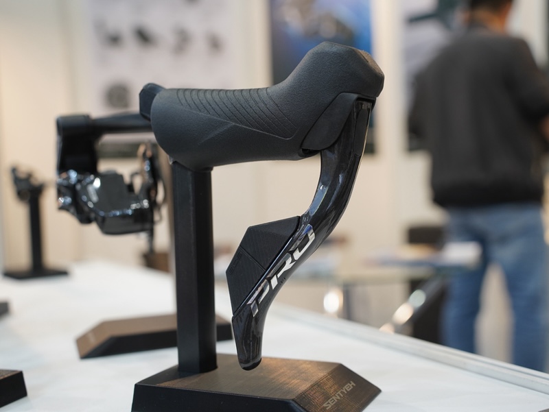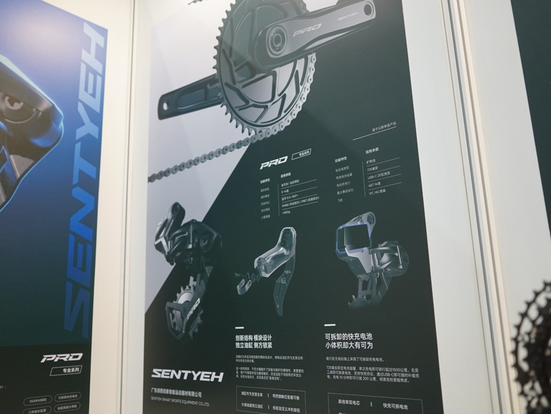 ビッグブランドに続く中国の第三勢力「センサー」の目玉は、驚異の14速コンポーネント! 油圧ディスク+無線変速を実現した「ECS Pro」を展示していた。リヤディレーラーとレバーは共にスラム・eタップに似た構造で、満充電で1500km相当のシフトをカバーする。存在感あるカセットの歯数は11-46T。フロントシングルのクランクは46、48、50T。13速の機械式グループセット「EVS 13」も展開。