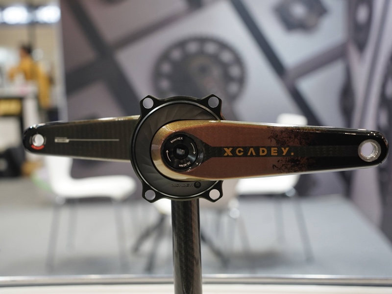 2025年から日本参入を果たした中国ブランド「Xcadey(エックスケイディ)」。写真のクランク「ヴェントゥス Xパワー」は市販にはないカスタムペイント品。重量100g切りの電動ポンプやサイクルコンピューターなど、技術力の高さが伺えた。
