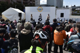 自転車系人気ユーチューバーが登壇すると、ステージ前のベンチに座りきれないほどの人が集まってきた。左から、なななチャンネルさん、yumi yummy チャンネル(ゆみやみちゃんねる)さん、けんたさん。撮影秘話など楽しいトークで盛り上がった