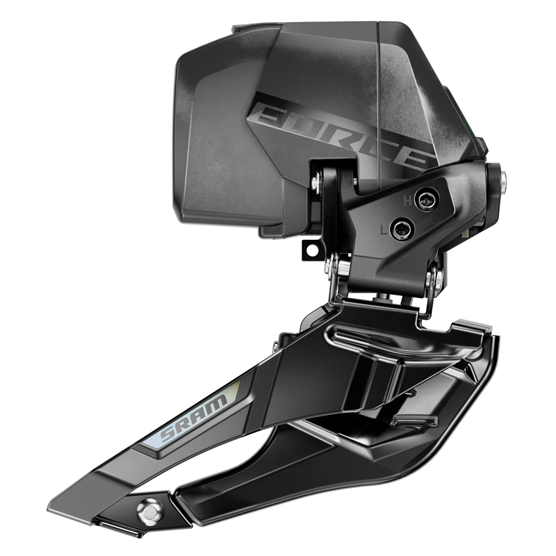 パフォーマンスを追求して開発、改良されたフォースAXSフロントディレーラーは、シフト速度と精度を高めただけでなく、全ギヤで静粛性も確保する。ケージ幅を狭くし、ヨーテクノロジーとオートトリムとを組み合わせることで変速性能を改善した。