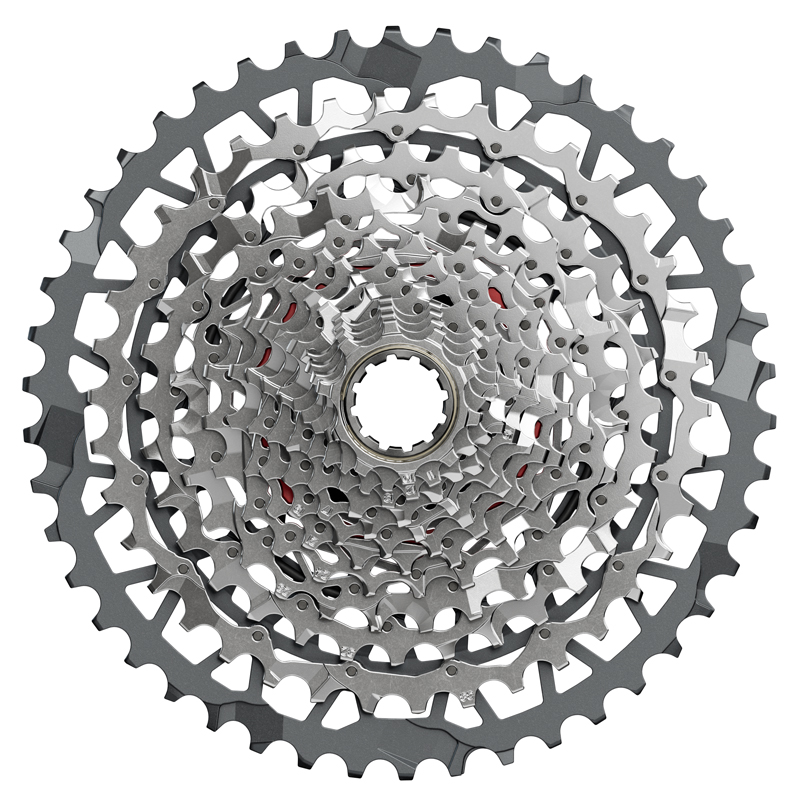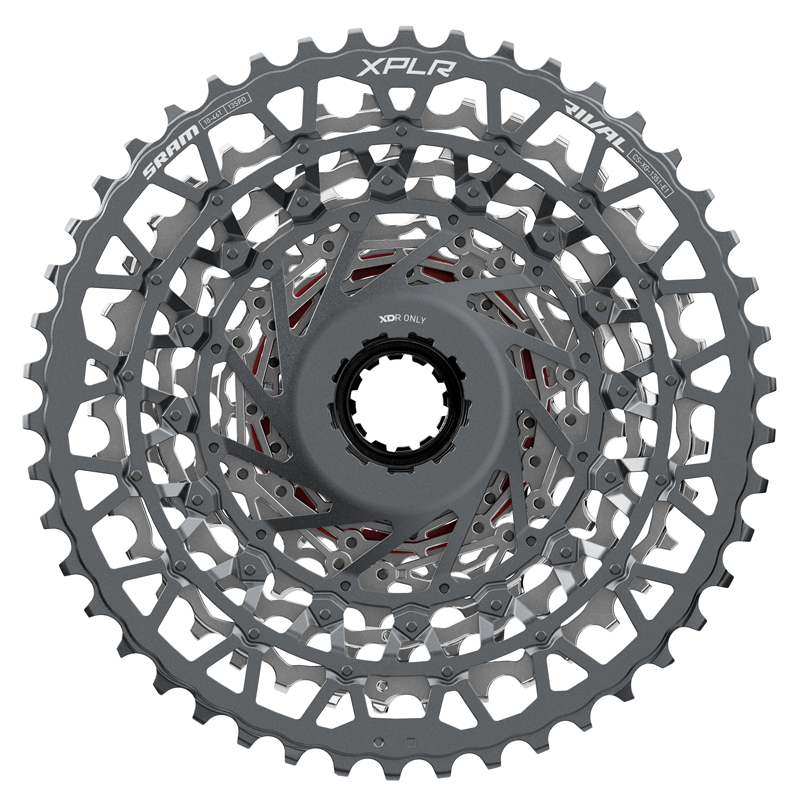 ライバルXPLRの13速カセットも、10-46Tのレンジとタイトな歯数ステップを備える。
