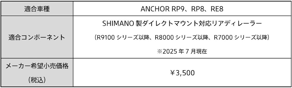ユーザーからの要望に応えて「ダイレクトマウントディレーラーハンガー」を開発、9月下旬に発売する。アンカーRP9、RP8、RE8に適合しており、部品点数が減ることにより軽量化を実現する製品。