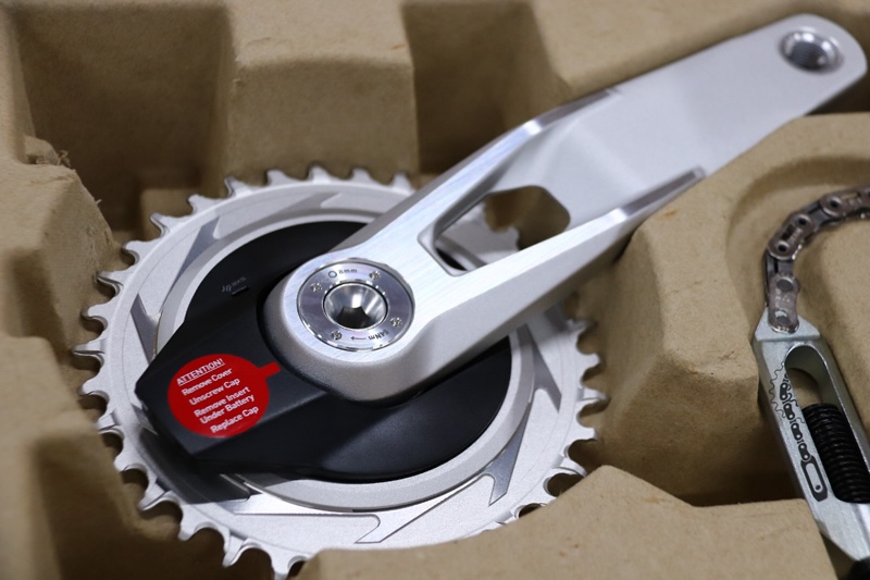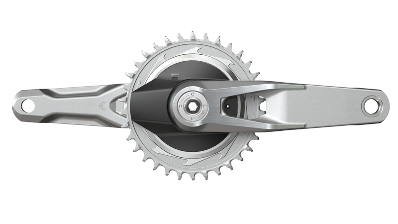 XOクランクアームをベースに特別な鍛造工程を使っており、左クランクアームとスピンドルを一塊のアルミ素材から削り出して作られている。この「ベンディング・フォージング」製法に加え、高精度な機械加工を施したことで、市場でも最も軽量なアルミクランクのひとつになったという。また、このモデルではXXSLやロードのレッド、フォースにも採用されているスレッドマウント式のパワーメーターを搭載している。仕上げはすべてシルバーのダブルアノダイズで、プレミアムな外観を実現。チェーンリングは34Tが標準装備されるが、専用工具と32Tチェーンリングも付属するので、34Tが大きすぎると感じた場合は自分で交換できる。クランク長は現在のMTBで最も一般的な170mmのみの展開となる。