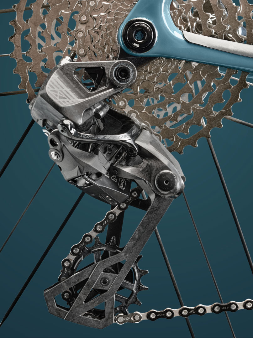 リヤディレーラーはスーパーレコードX専用品を用意。グラベルライドに特化した作りとなっており、UDH(ユニバーサルディレーラーハンガー)に対応。ロード用フロントシングル仕様のクランクセットと組み合わせても使えるため、グラベルバイク同等のワイドギヤなロードバイクも実現できる。