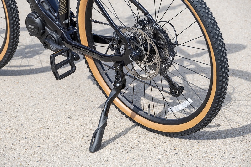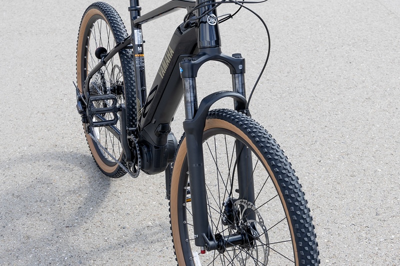 フロントフォークはコイルサスペンションを装備。標準状態では少し硬く感じたが、ソフトめに設定変更することで、フラットな未舗装路での走行安定性や乗り心地の良さの向上を体感できた。タイヤサイズは27.5×2.00でブロックパターン
