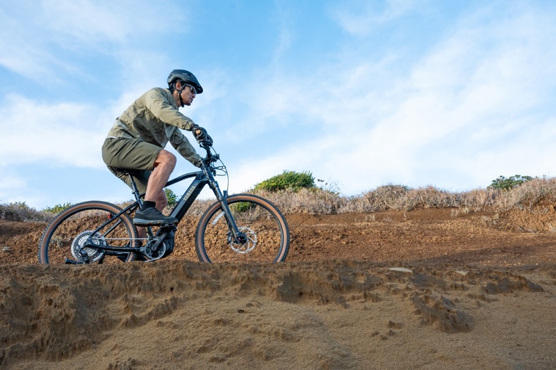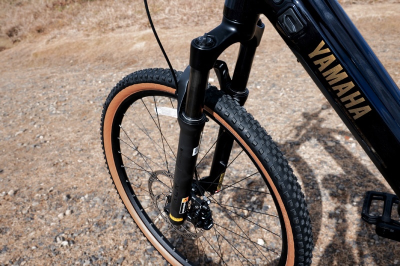 ドライブユニットはヤマハが独自に開発するPWシリーズの最新スペックとなるS2。75Nmのトルクを発生するので、トレイルライドなどで体験するきつめの勾配でもペダルの重さが大幅に軽減される。また、ユニットが小型なので車体と路面とのクリアランスに余裕があり、オフロード走行での走破性が向上しているのも、トレイルライドなどの冒険的なサイクリングに適した作りとなる。