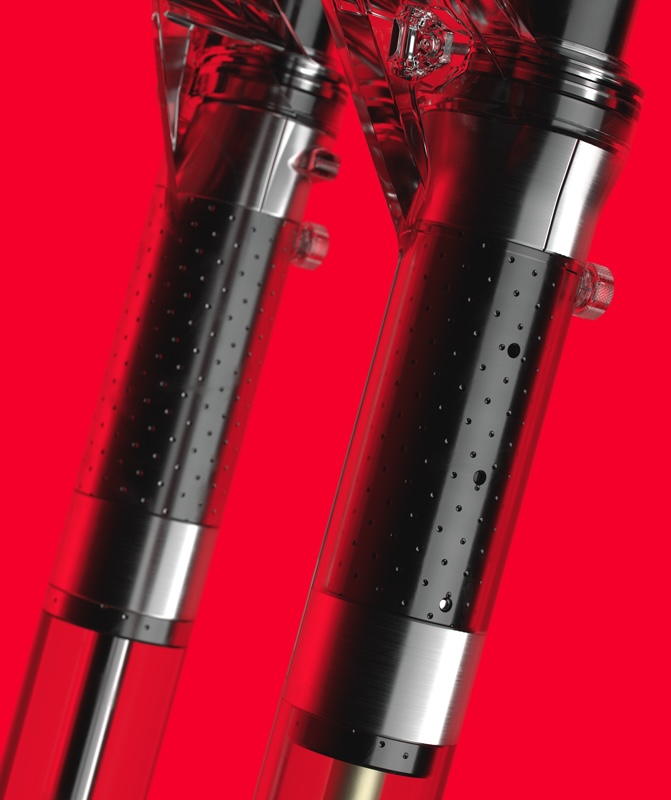 新開発のリニアXLエアスプリングにより、コイルのような乗り味を実現。初期はしなやかに動き、中間域ではしっかり支え、終端はジャンス・ボトムアウトバンパーによって確実に制御される。アルティメットグレード専用のバターワゴンテクノロジーは、トロークによってブッシング部へオイルを引き上げる新しい潤滑構造で、時間経過やロングランによるフリクション増加を抑え、スタートからゴールまで一貫したスムーズさを維持。ブレーキング時やコーナリング時でも路面追従性とトラクションを確保する。また、チャージャー3.2ダンパーは、高周波振動を物理的に遮断する振動吸収機構のバターカップを備えており、ハンドルに伝わる細かなノイズを低減し、長いランでも手の疲労を抑制する。さらに、直感的なHSC/LSC調整を行うことができ、セットアップが迅速で分かりやすい。