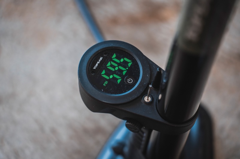 最大60psiまで測れるLEDデジタルゲージ付き(psi、bar、kg/cm²対応。英式バルブの空気圧測定はできない)