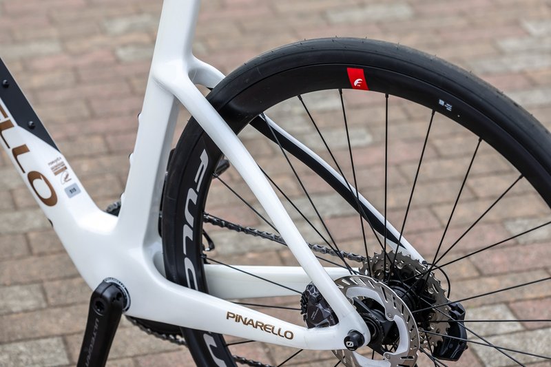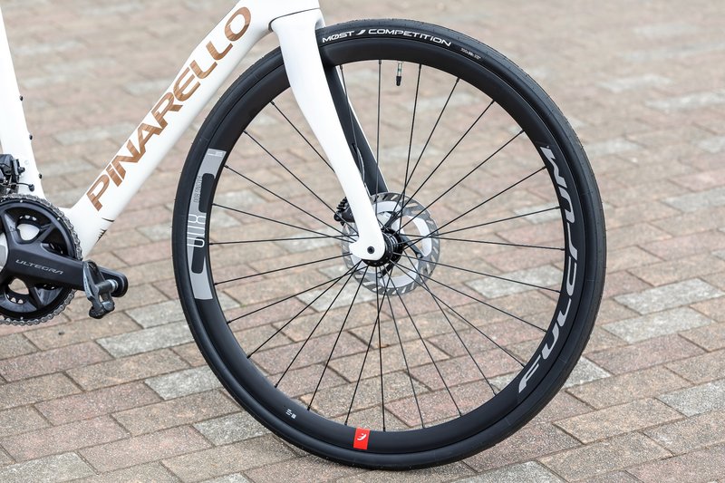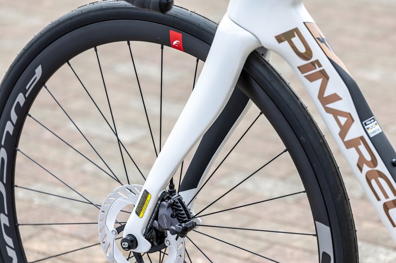 ニューF7に標準装着されるホイールはフルクラム・レーシング800 DB(前後セットで1960g)だ。ピナレロではお買い得なホイールアップグレードプログラムを用意しており、そのランナップは現状で24種類もある。例えばカンパニョーロのボーラウルトラWTO 45 C23(同1325g)を選択した場合、完成車価格は168万円となる。これはホイールを通常販売価格で購入するより11万3600円もお買い得となるのだ