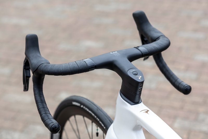 コラムをクランプするのではなく、後方からウスを押し付けて固定するタイプのタロン・ウルトラファースト一体型コックピット。ハンドル幅/ステム長の組み合わせは40cm/80mmから46cm/140mm(ハンドル幅は外-外)まで16種類がオプションで用意されており、全てのサイクリストに完璧なポジションを提供するというピナレロのフィロソフィーが、こういったところにも反映されている。下ハンの絶妙なアールと断面形状による握りやすさにも注目を