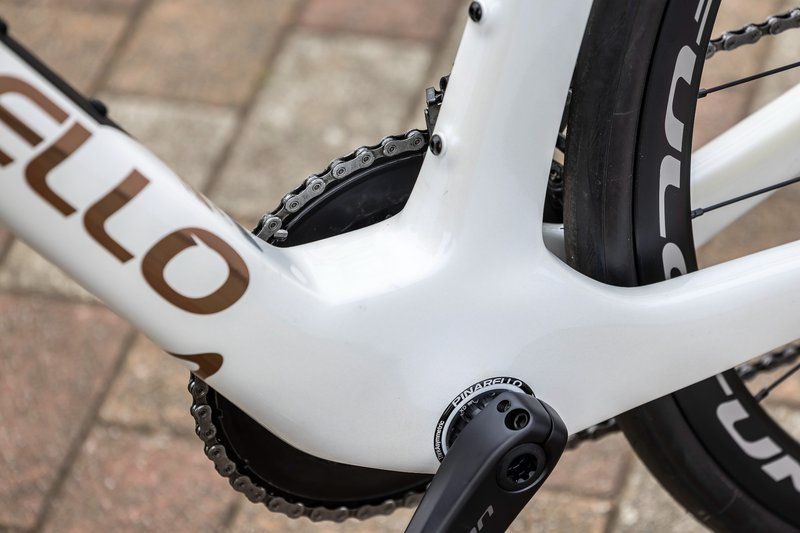 スレッド式のイタリアンBBを採用。他ブランドがBBエリアを拡幅して剛性を高める中、ピナレロは狭さによる空気抵抗軽減に重きを置いているようだ。さらにニューFシリーズではエアロキールというデザインを付加し、ドグマFよりも容積を削減しつつ剛性を高めている