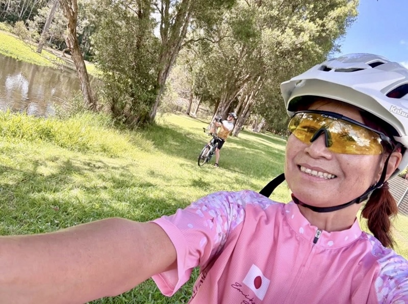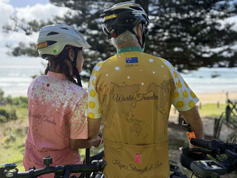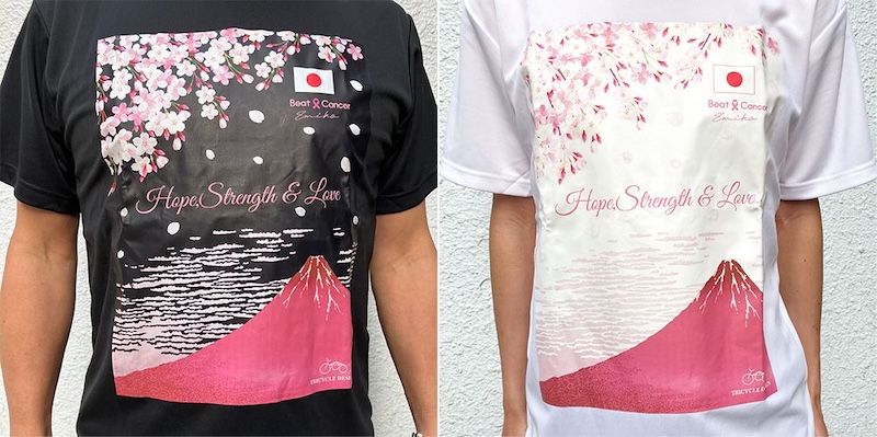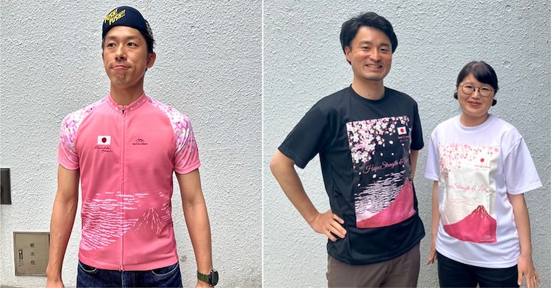 このTシャツ、サイクルジャージは、エミコさんが愛する日本の富士山、桜、桃色を採用し、世界地図による旅、こだわり、人生を表現しました。