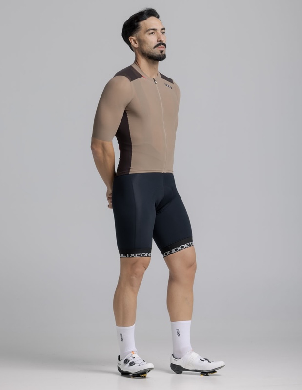 エチェオンドのフラッグシップとなるビブショーツ「オルヒ」は、独自の2ピース構造と裾のフリーカット仕上げにより、縫い目を最小限に抑えた「第2の皮膚」のような着心地を追求。高い着圧と伸縮性を備えた生地が、筋肉をサポートしつつ優れた空力性能を発揮する。