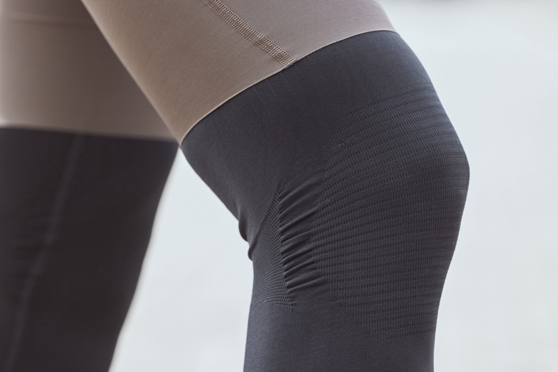 ビブストラップを除けば、ショーツを構成する生地はわずか2枚。臀部から脚を包み込む大きなパネル構造が、オルヒ特有のクリアで吸い付くようなフィット感を生み出している。切りっぱなしの裾は極めて低刺激で、全身を均一かつ心地よい着圧で包み込んでくれる。
