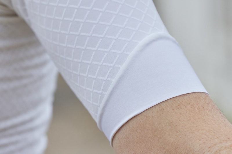 袖には専用のテクニカル素材とフリーカットを採用し、空力性能と肌に馴染むフィット感を両立。さらに低めの襟元が酷暑期の首回りに涼しさを与えてくれる。デザイン面にも抜かりはなく、格子状のテクスチャが洗練された印象を与え、ライダーの佇まいを引き立てる。