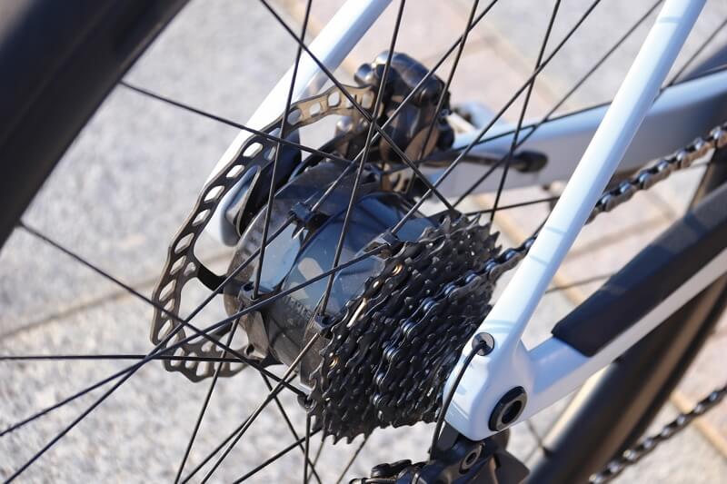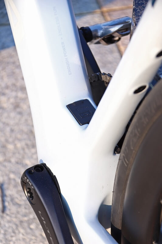 初見の印象では、「あれっ? eバイク?」と思うほどにデザインは秀逸。クランクセットがダブルのアルテグラなこともあって、言われなければeバイクと気が付かない人も多いだろう。乗ってみると、ロードバイクとして王道を行く素直なハンドリングで実に気持ちいい。一般的にリヤハブモーターは前後重量バランスがやや気になるモデルが多いが、このマーレシステムはバッテリー積載位置も秀逸で落ち着きのある重心ポイント。そしてBBまわりにユニットがないので、適度にウィップのある快適なフレーム設計が実現できている。アシスト力はロードバイクとしては十分なトルクで、レスポンスもハブモーターとしては俊敏。ロードバイクの場合はMTBほどレスポンスは求められないので、確かにハブモーターのフレーム設計の自由度の高さはメリットだ。