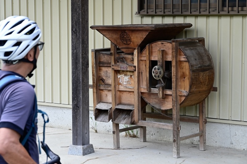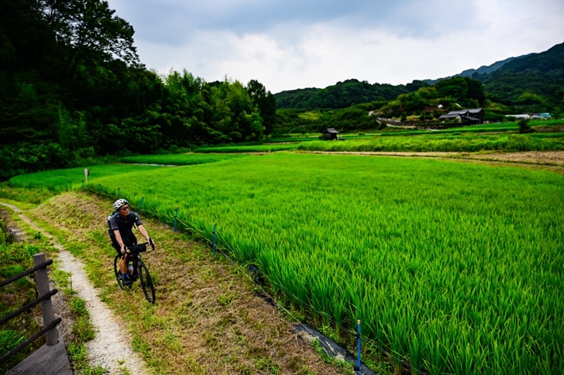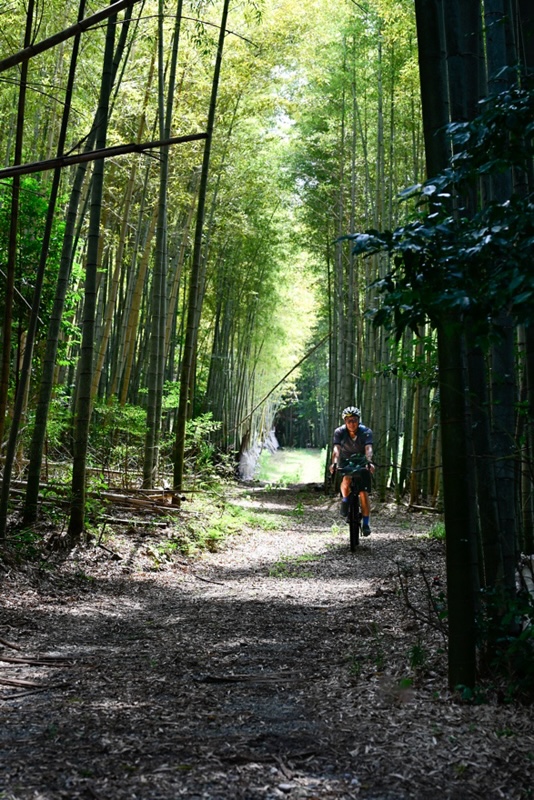 道はその先で竹林のジープ道に変わり、しっとりとした緑の中、どこか幻想的な世界へと誘う。グラベルバイクの太めのタイヤが、笹の葉を踏み乾いた音を立てていく。やがて道は墓地の中を縫うように進み、田んぼの真ん中を走るコンクリート道に出る。猫の目のように景色を変えるこの道に、シシャチョーは驚きの声をあげた。