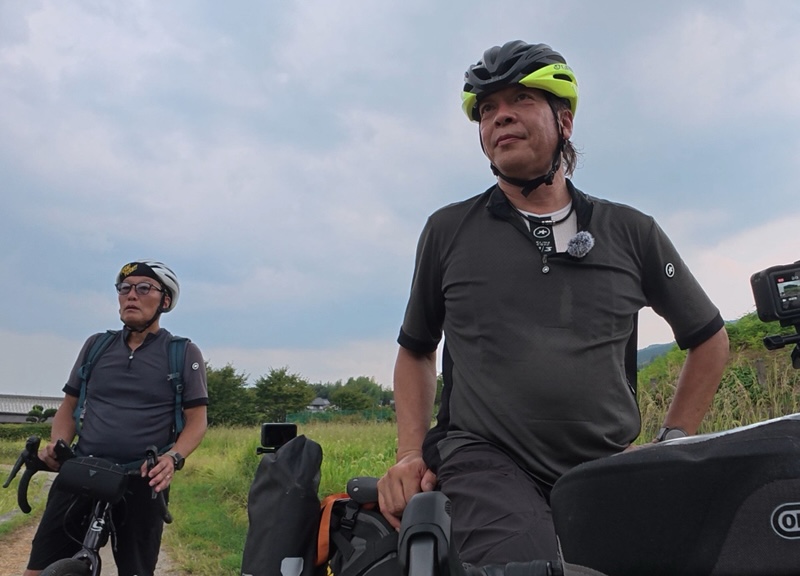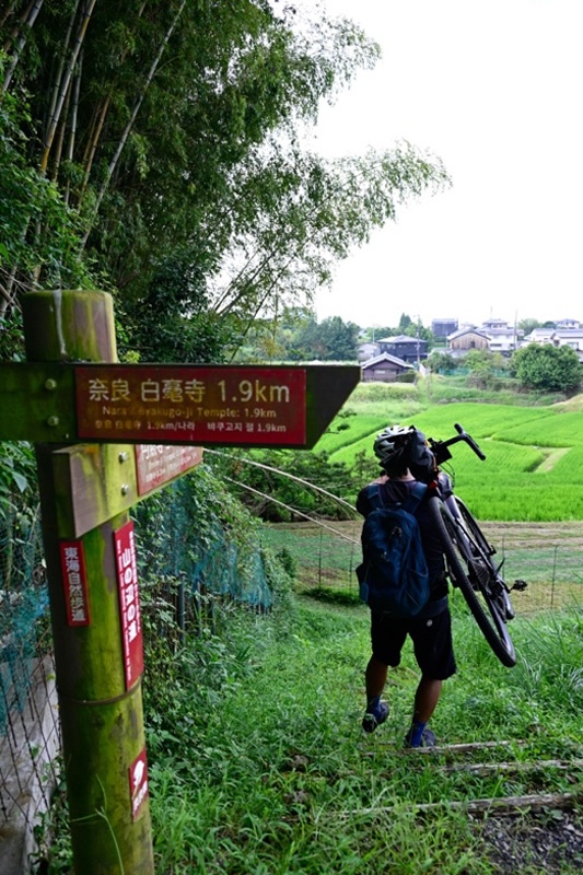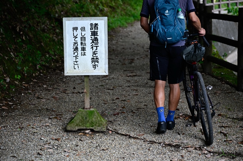 柵を開けて階段で崖下まで降りる。古道はやがて細い路地を抜け、民家の庭先をかすめ、ため池のほとりを通る。何度も柵を開けては押し歩き、舗装路に出てはペダルを踏み、また担ぐ。私とシシャチョーは自転車を担ぎ、汗をぬぐいながら思わず顔を見合わせて笑った。