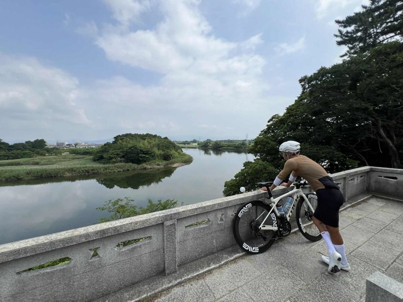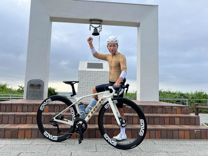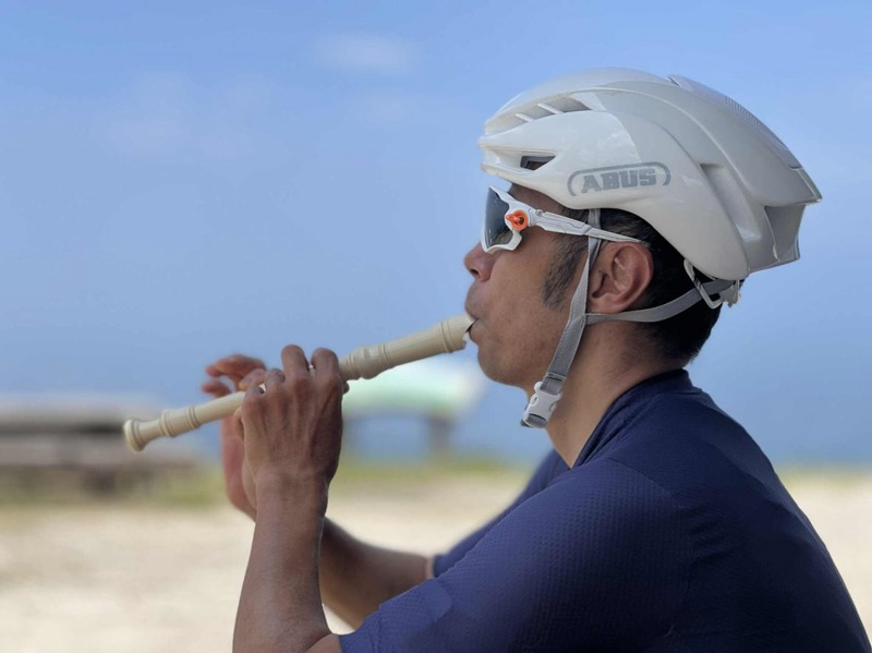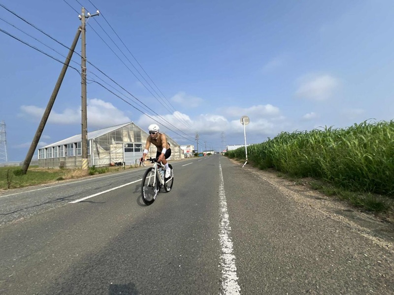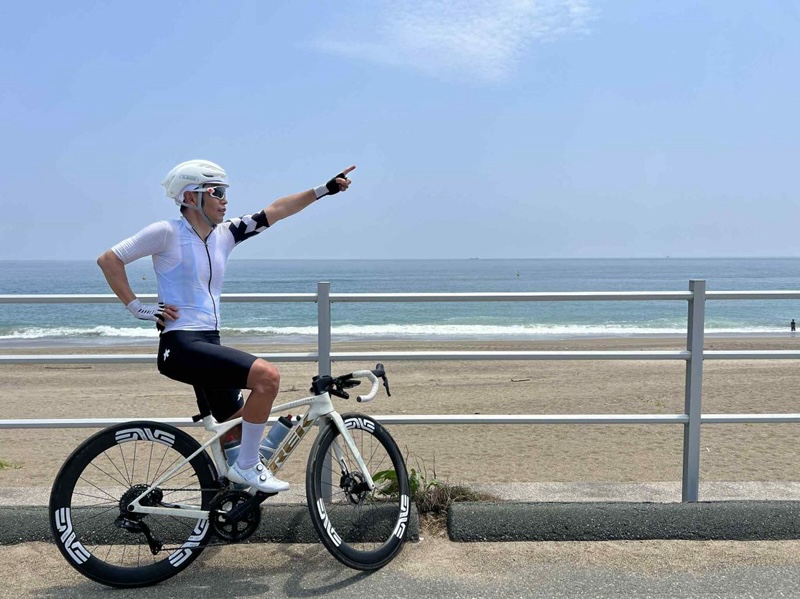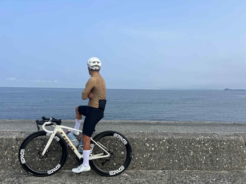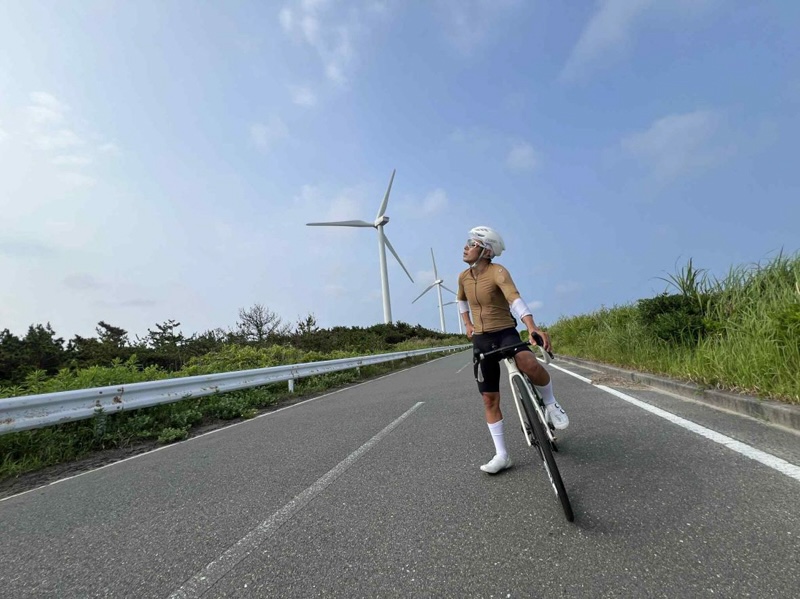 左側に穏やかな三河湾を見ながらどこまでも続くような感覚になる道を⾛り始めると、すぐに風力発電用の大きな風車、数基の姿が目の前に飛び込んでくる。この日は風もなく、その雄大に回転する大きな羽や、風切り音を体感することはなかったが、動いていなくても近くで見るとその途方もない大きさに圧倒される。冬には西からの強い風を受け勢いよく回転するのだろう。巨大建造物は良い、何故かワクワクし心が惹かれてしまう。僕は巨大な建造物が好きなのだ。伊良湖岬先端では歴史あるトライアスロンの大会なども開催されており、サイクリストだけでなくトライアスリートも良く練習をしているらしい。