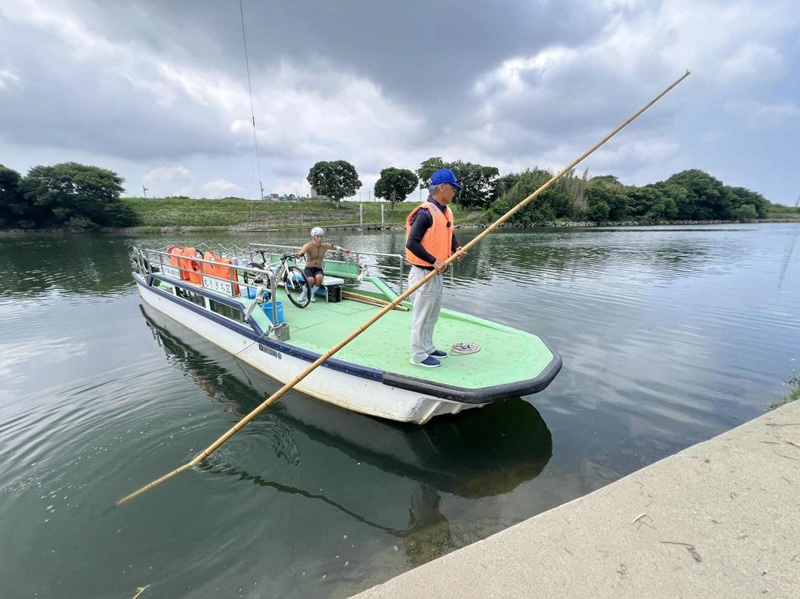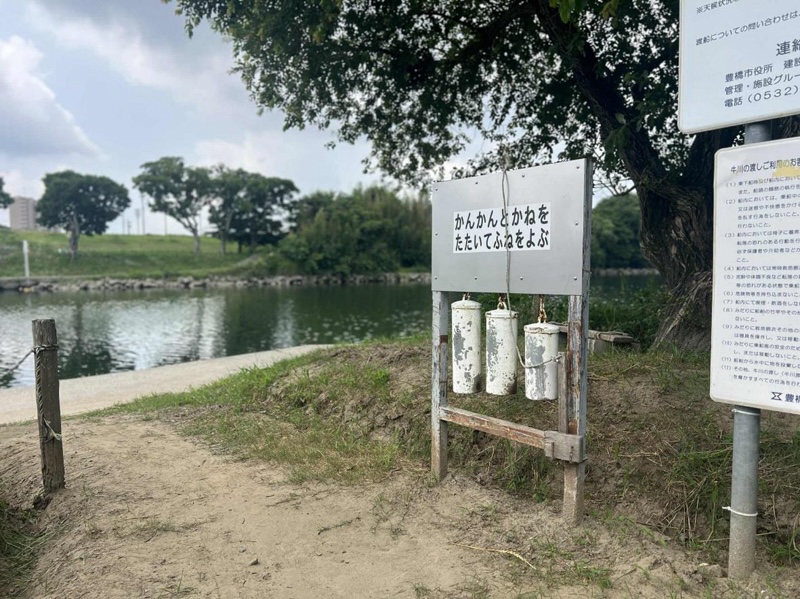 この豊川を渡河するにはもちろん通常の道もあるわけだが、いまではあまり見られなくなった渡し舟があり、以前の旅で訪れたその存在を思い出したのでそこへ向かうことにした。「牛川の渡(うしかわのわたし)」という渡船場で、人と自転車を対岸へと運んでくれる。料金は無料だ。通学などで行き先を急ぐ時間帯の所要時間は2分ほど、それ以外の通常運転では5分ほどの乗船を楽しむことができる。数年間には豪雨で船が流されてしまい、一時運休となっていたらしい。僕は興味を持ったあれこれをおじさんに尋ね、その会話がとても楽しかった。