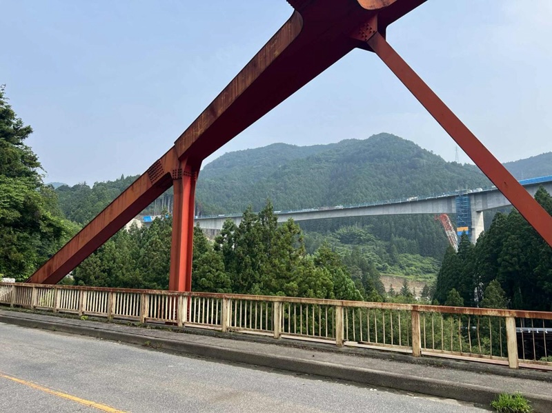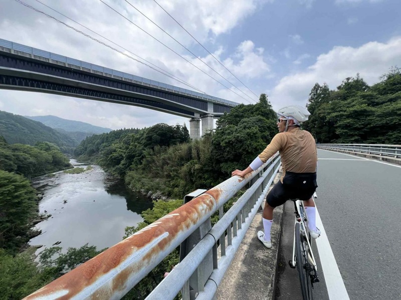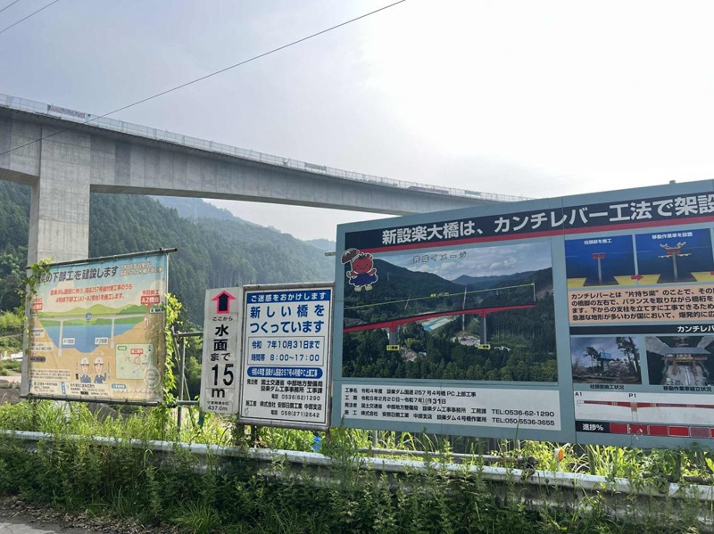 田口の街を抜けると左手に大規模な工事現場が広がってきて、目の前には巨大な橋・新設楽大橋の建設現場が見えてくる。設楽町は現在「設楽ダム(2034年完成予定)」の建設工事が進んでおり、そのために架け替えとなる建造中の橋がはるか上空に見える。いまこうして⾛っているこの道も何年後かにはダムに沈むのかと思うと何とも言えない不思議な気持ちになった。僕がいずれ完成するあの道を自転車で⾛ることはあるのだろうか。