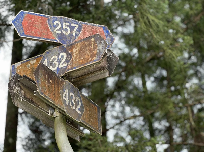 道路脇にある道標看板も苔むしてしまうほどの、奥三河らしい緑の中をひたすら標高を上げながら進む。この深い緑が奥三河らしい色合いだ、信州などの明るい緑色とは雰囲気そのものが違う気がする。