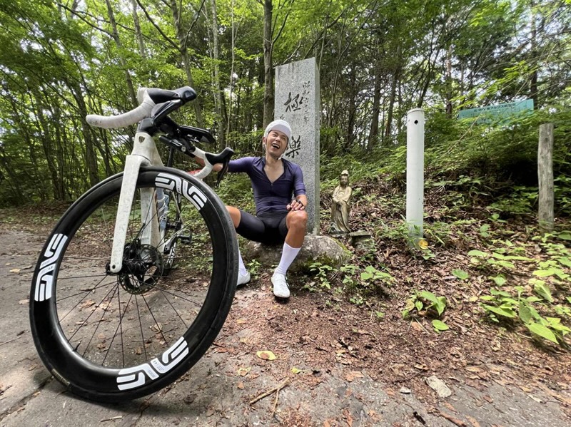 標高1187mの治部坂峠を越え、浪合集落より本日のメインディッシュとも呼べる極楽峠の上りへと差し掛かる。距離は約4km、平均勾配は約9%で、特に浪合集落からの道は、お世辞にも⾛りやすいとは言えないが、ここで何故か自分のスイッチを入れ、全力でアタックを開始する。ここを訪れたのは約20年前だ。そしてオールアウトしそうなゴールの先に見えたのは「極楽峠」という立派な石碑と美しい仏様の姿だった。