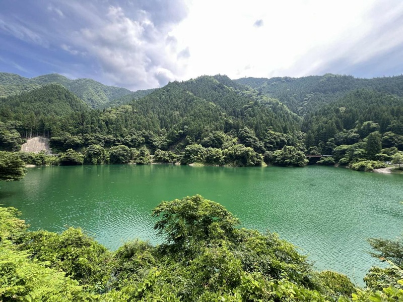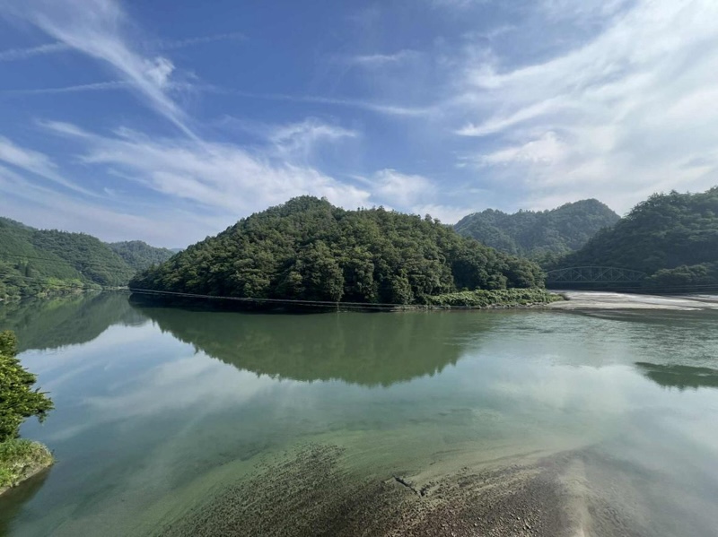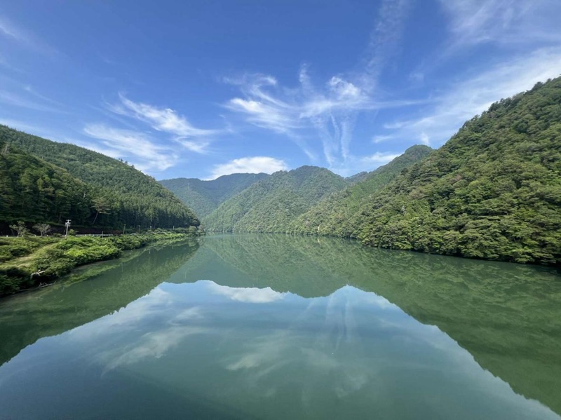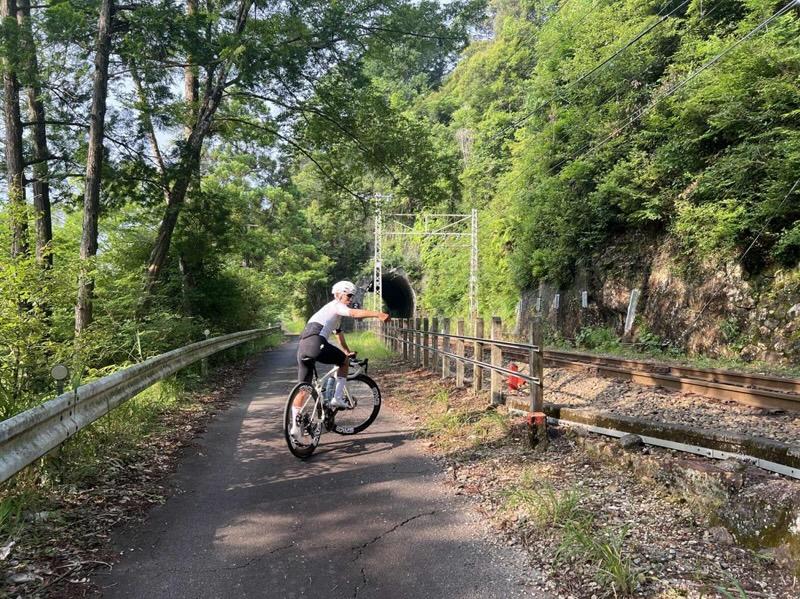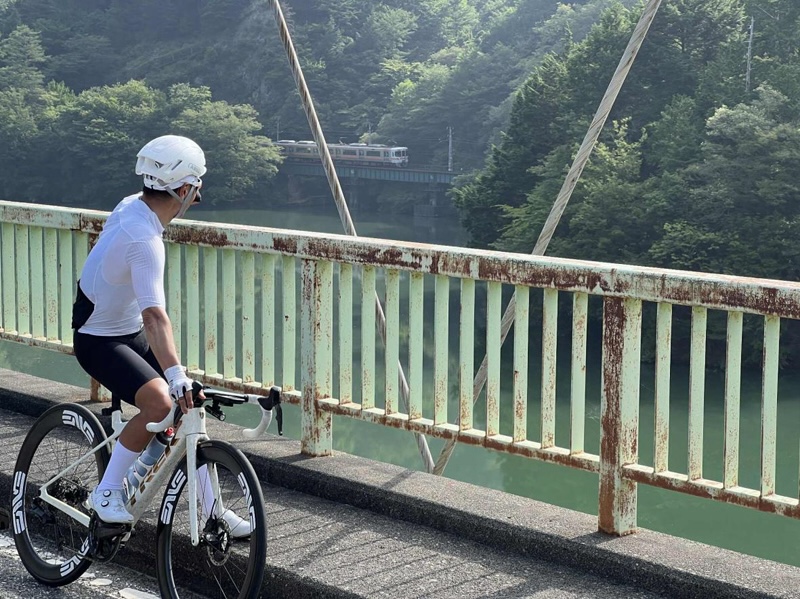 この日は無風で、その山の緑を映した水鏡や、場所によって少しずつ色合いを変える緑色、そしてなにより静寂がすばらしかった。鳥の囀りを聞きながら湖面を眺めていると対岸(そこはクルマでは行けない秘境駅区間だ)を⾛る飯田線の音が時折聞こえたりもした。「おお! これぞまさに秘境。ここは日本なのか?」と思わせる風景に、この三遠南信エリア山間地の持つ奥深さと、そこに自転車で旅する速度感が合わさりなんとも言えない穏やかな気持ちになった。