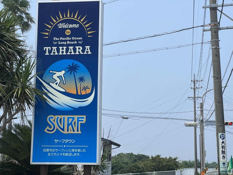 サーフスポットのロングビーチ近くには「サーフタウン」の看板が。それに合わせ住宅地も造成されるなど、田原市の本気を感じます。以前、神奈川に住んでいるころ、海岸線を⾛る度にサザンオールスターズの曲を口ずさんでいた。田原を⾛るとどの曲がマッチするのかな
