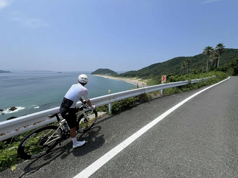 自分に浸るのも悪くはないが、自ら旅を自分で始めたからこそ、やはりちんと旅をこの手で終える必要がある。残りは約18km、さぁ、この旅もいよいよ終わりだ。伊良湖岬付近、「日出門(ひのでもん)」の最後の短い上り坂を越えると左手にはアクアブルーの太平洋が広がり、右手には伊良湖岬先端と「これぞまさに伊良湖岬!」と呼べる風景を眺め「帰ってきたぞー!」と心の中で叫んでいたが、きっと溢れる感情とともに大きな声が口から出ていた気がする。そしてゆっくりと恋路ヶ浜へ向かう。四日ぶりに帰ってきた、帰ってきたぞ。ビンディングを外し、自転車から降りる。ゆっくり息を吐きだし、サングラスを取る。「ようやく終わった。終わったぞ」。愛知、長野、静岡を跨ぐ、三遠南信エリアをぐるり巡る380kmの旅はずいぶん長い旅だったように思えた。