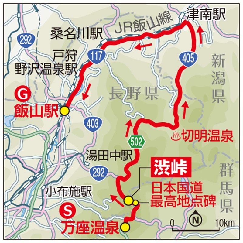 前日に標高1800m地点に位置する万座温泉まで上って投宿したため、登坂距離は控えめ。しかし秋山郷からはアップダウンの連続のため、トータルで約1800mアップのルートとなる