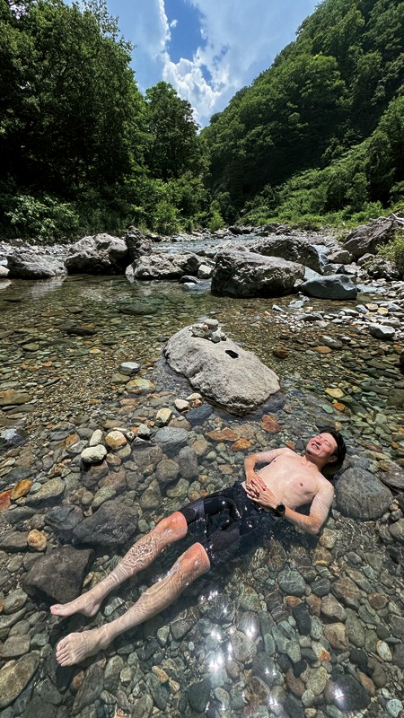 やってきました切明温泉! 中津川の水と川底から湧き上がる源泉(泉温約54℃)による完全なる野湯! 先人がスコップで掘ってくれていたので、快適な湯温の場所を見つけてレーパン一丁でドボン。周囲にはただ大自然、こんなにうれしいことはない