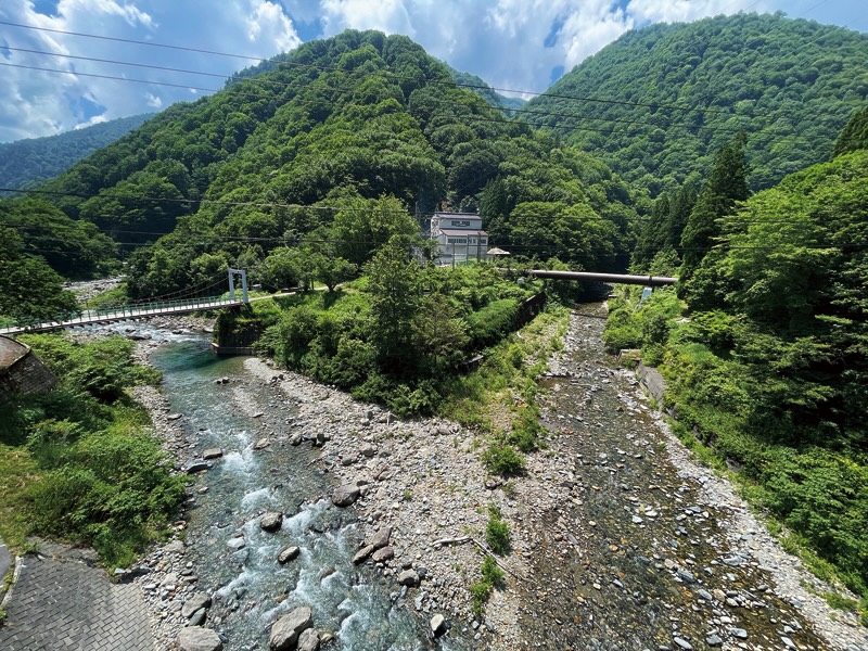長い林道を下りきると、轟音と共にヘリコプターが降りてきた。水力発電所の資材を運ぶためらしい。その脇の川の先に、「切明温泉」らしき一角が見えた。足を浸けると、川底から湯が湧いている。雪解け水と熱い源泉が入り混じる場所を探し当て、全身を浸す。