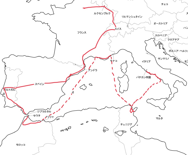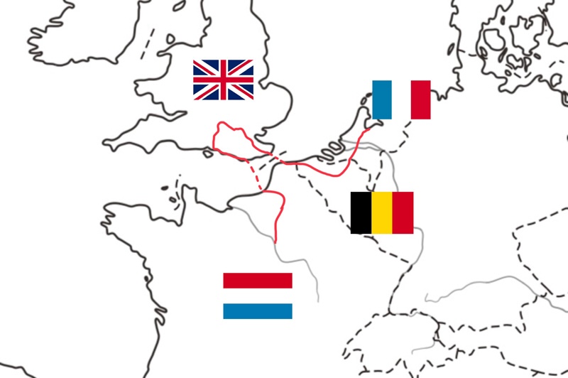 今回のルート。自転車王国オランダの首都アムステルダムを出発し、南西へ。ベルギーの首都ブリュッセルへ向かう。その後はユーロヴェロ12 「北海サイクルルート」沿いにフランスの港町カレーからドーバー海峡を船でイギリスに渡る。ロンドンを含めたイングランド南部を走行後、フランスに再び船で戻り、首都パリを目指した