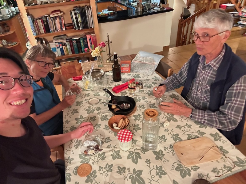 今日は近くでキャンプの予定だったが、予定を変更して彼の家に滞在することに。今夜から雨が降る予報のため、非常にありがたかった。夕食に彼の牧場で作られたチーズをいただき、充実した時間を過ごした。