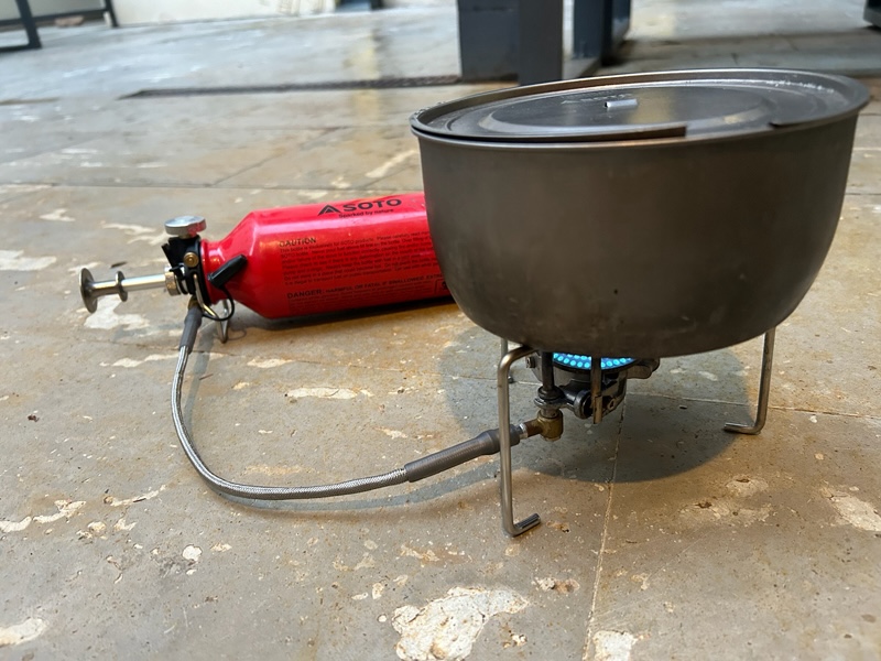 アルベルゲ屋外の自炊スペースで調理中。やはりガソリンストーブは火力が高い。あっという間に湯が沸く。旅で愛用しているMUKAストーブは車用ガソリンでホワイトガソリンと同性能を発揮する。どこでも手に入るという安心感は何が起こるかわからない旅において唯一無二の存在だ